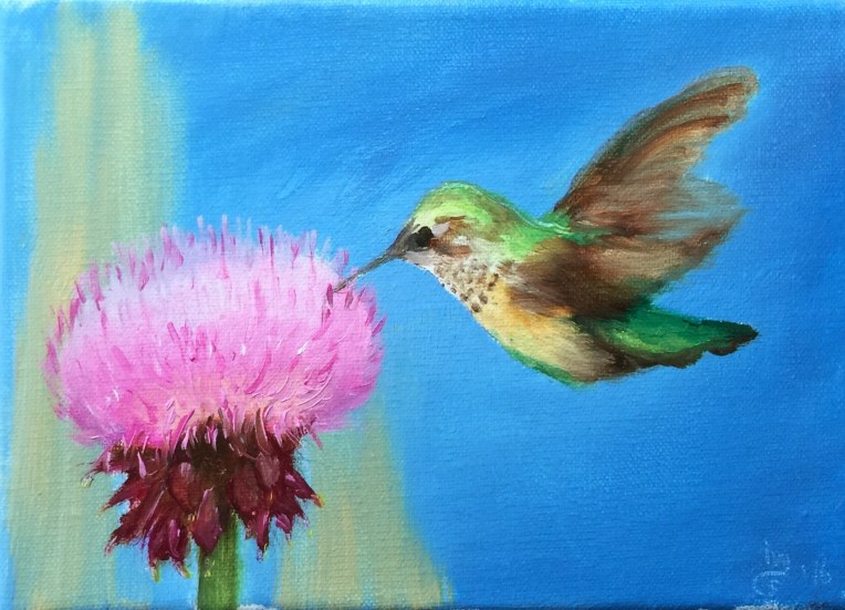 Nature’s Hummer March 26, 2016 | macivy 5 x 7 oil on canvas $35 Share this: Click to share on X (Opens in new window) X Click to share on Facebook (Opens in new window) Facebook Like Loading...